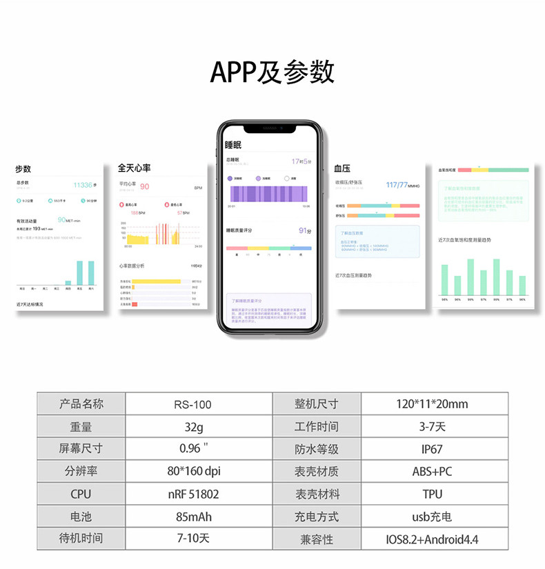 産品型号:RS9006(運動版智能手環 主控芯片:nRF51802 傳感器(qì):ROHMS 心率:艾普科(kē)微 EM7028 震動:靜(jìng)音/震動 防水(shuǐ)級别:IP67 屏幕尺寸:0.96 英寸 160*80 屏幕類型:TFT 藍牙:4.0BLE(低功耗) 電池類型:聚合物(wù)锂電池 電池容量:85mAh 充電方式: USB充電 充電時間:約2H 續航時間:使用(yòng)3-7天、待機10天 數(shù)據儲存:1個(gè)月 操控方式:觸摸操控、手機APP控制 兼容系統:Android 4.4及以上版本,iOS 9.0及以上版本 特色功能:3D動态界面、炫酷提醒燈、24小時連續心率