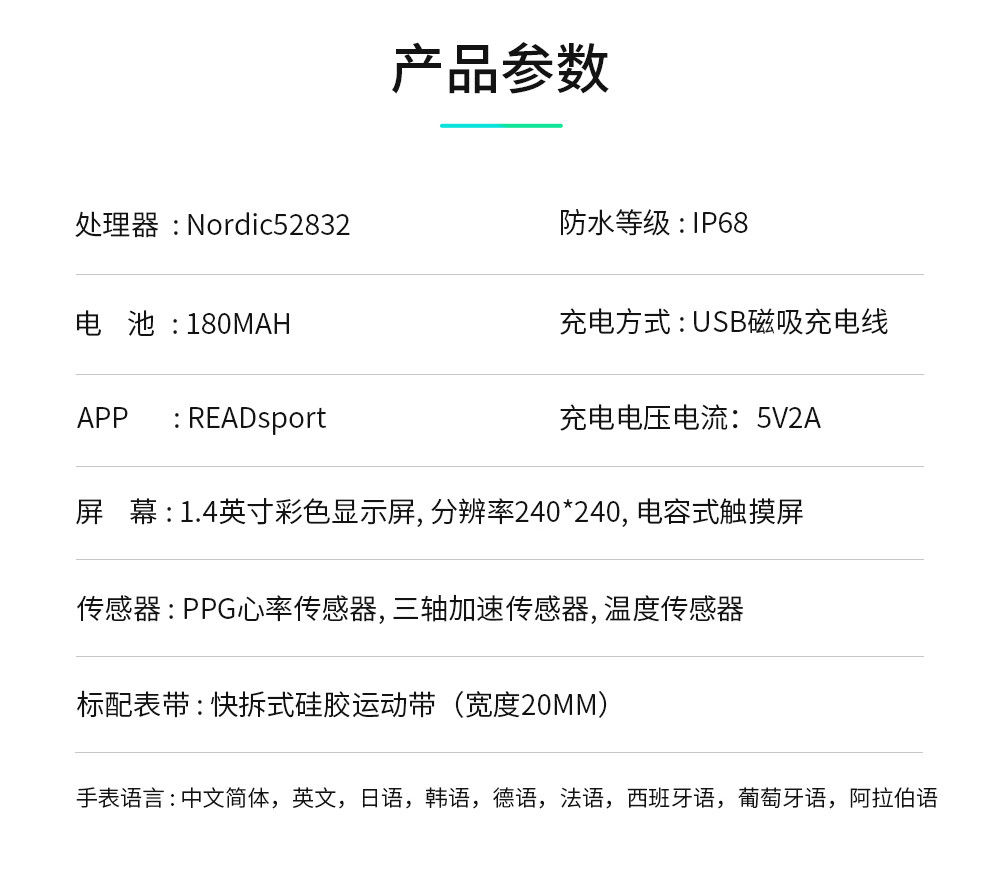 産品類型:智能穿戴 | 信息推送:支持 屏幕尺寸:1.4inch | 來電提醒:支持 分辨率:240*240 | 防水(shuǐ):IP68 操作平台:NRF52832 | 震動模式:支持 材質:鋅合金 | 側鍵:支持 內(nèi)存:64KB+512KB | 充電器(qì):磁鐵彈簧針 存儲:64M bit | GPS:不(bù)支持 功能介紹 | APP:支持專門(mén)APP 藍牙:藍牙 4.0, 支持安卓和iOS系統 | 語言:多語言 多運動模式:支持 | 手表語言:APP語言 心率測試:3300光學(xué)心率傳感器(qì) | 說(shuō)明書(shū)語言:手表語言 體溫測試:支持 | 結構特點 呼吸功能:支持 | 尺寸:43.25*36.25*9.5mm 節拍(pāi)器(qì):支持 | 電池:180MA 計(jì)步器(qì):支持 | 顔色:玫瑰金,黑(hēi)色,銀(yín)色 睡眠監測:支持 | 包裝尺寸:102*83*68MM G-傳感器(qì):支持
